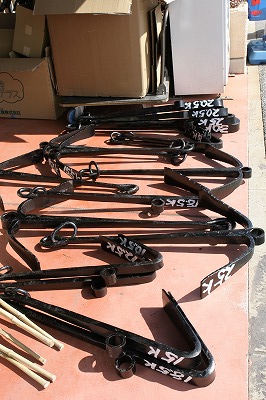 錨入荷~♪ アイテム 2012年03月05日 どうもー、今年も元気に花粉症の症状が出てきてしまったかじたくですー。 花粉症は人はわかると思いますが、毎年この時期はほんとうに大変です。 かじたくは鼻の粘膜をレーザーで焼いているのでかなり楽になったのですが、 それでもくしゃみが止まらなくなりますね。 それでも鼻づまりはかなり改善されたので、花粉症の方にオススメですよ~。 さて、そんな春の日。 捨てアンカー(片爪錨と唐人錨)が入荷して参りました。 ご存知、港に係留する時に沈めっぱなしにする錨です。 一度打ってしまえば、基本的に打ちなおすことがない錨ですので、頑丈さだけが取り柄です。 コーガイ(エギ)はパイプ製のものがあるのですが高価なので、 角材を打ち込んで使うことをお勧めしています。