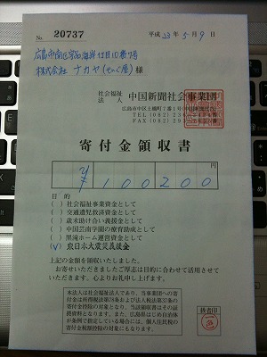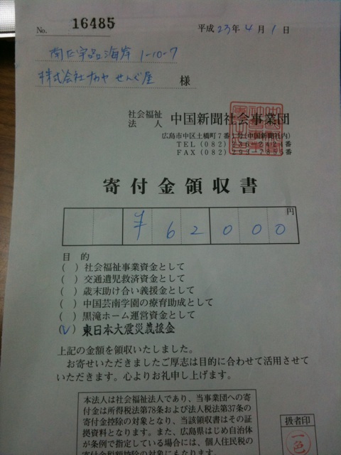 義捐金を送らせていただきました お知らせ 2011年04月01日 せんぐ屋 店長の梶村です。 この度の震災に際し亡くなられた方々のご冥福と、 被災された方々の一日も早い復興を心より祈念致します。 また、今なお救助や原発で作業に当たられている皆様に感謝し、 安全をお祈り申し上げます。 災害から3月末までで620着のライフジャケットをお買い上げいただきました。 義捐金額は62000円になります。 本日、社会福祉法人 中国新聞社会事業団へ義捐金の寄付をしてまいりました。 義捐金は日本赤十字社を通じて被災地へ送られます。