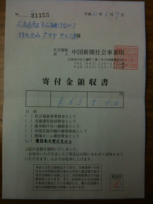義捐金を送らせていただきました お知らせ 2011年06月07日 せんぐ屋 店長の梶村です。 この度の震災に際し亡くなられた方々のご冥福と、 被災された方々の一日も早い復興を心より祈念致します。 また、今なお救助や原発で作業に当たられている皆様に感謝し、 安全をお祈り申し上げます。 5月は635着のライフジャケットをお買い上げいただきました。 義捐金額は63500円になります。 本日、社会福祉法人 中国新聞社会事業団へ義捐金の寄付をしてまいりました。 義捐金は日本赤十字社を通じて被災地へ送られます。