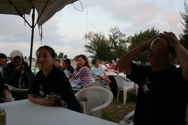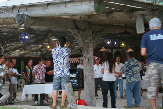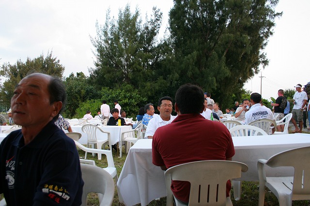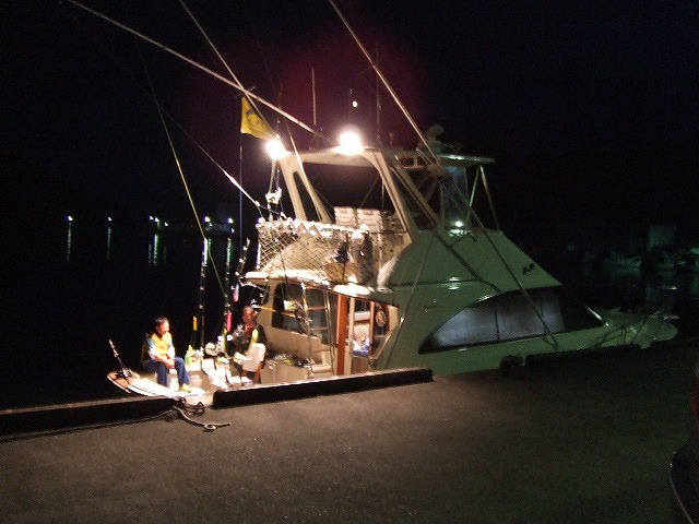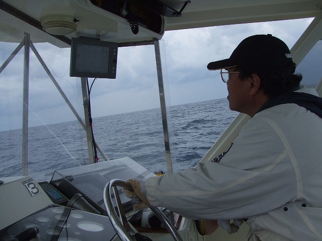 SAM's CUP 2009 参戦記 その2 トローリング 2009年06月05日 いや~、昨夜は久しぶりに飲みすぎました。 やっぱアレですね、豆腐ようと泡盛のコンビは確実に人間をダメにしてくれますね。え?もうダメになっていますか。そうですか。 朝ホテルで目を覚ますと、隣に全裸の美女なんかは寝ていなくって、代わりに何故か溶けてしまったハーゲンダッツが。 そーいえば、昨夜ホテルに戻る前にホテルの隣のコンビニに寄って、キャプテンと2人で、やっぱ酒飲んだ後は甘いもの食べなきゃね!とか言いながらはしゃいでいた気がする。。。 人間酔っ払うと何をしでかすか判らないという良い例ですな。(反省の色なし) ま、気を取り直して先に進みましょー! *************************************** SAM's CUP 2009 参戦記 その2 *************************************** 本日の予定は、明日以降のトーナメント本番を見据えた下準備と偵察。簡単に言えば天気が良いからトローリングに出ようということ。 溶けたハーゲンダッツを見ていたら無性に悔しくなったので、出航前にコンビニへ寄ってお昼ごはんと一緒に再度ハーゲンダッツをゲット。今日の朝ごはんはハーゲンダッツとなりました。 さて。 本日は久米島の周辺でトローリング。視界に島影が入るところでトローリングするのは、多島美を誇る瀬戸内に生まれ育ったものにはやっぱり安心できる。360度見渡す限り水平線と言うのはそれはそれで感動なのだけれど、どことなく落ち着かない感じがするのだ。ちょっと足の裏がムズムズするような。 今日のトローリングはスペシャルなゲストがいらっしゃっていました。その方は何と元海上自衛官で海将まで勤められた方です。昔風に言えば中将閣下。バリバリの海の男じゃないですか!海の男マニアの血が騒ぐってもんです。<? 何でもキャプテンのボランティア活動でのお知り合いだとか。とても物腰が柔らかく、スマートネイビーを体現された方でした。 昨日の雨もあって、まだ少々うねりの残る海では、やっぱりと言うか少し酔ってしまって、すぐにシーバンドを装着&酔い止め薬を服用。中将閣下に貴様それでも日本男児かぁ!と檄を飛ばされるかと内心ひやひやしていたのですがそんなこともなく見事にスルー。 少し横になったり、良くなってきたらアフトデッキで流したルアーを眺めていたりしていると、11時過ぎにジャーッ!!という音が! ちょうどキャビンでウツラウツラしていた時だった(昨夜の深酒が効いた)ので、すぐに飛び起きてアフトデッキへ飛び出すと、既にお祭り騒ぎ。 おっしゃ、来たでー! ライン巻けー!巻けー! 前進前進!! 突如唸りを上げるエンジン。 ガツンと加速を始めるボート。 ジャッジャーッというドラッグの大きな音。 どうやらセンターに来たらしい。遠くでカジキが跳ねている! アングラーは同行のナカガワさんの予定だったので、とりあえず左コーナーのリールに飛びつき巻き始める。 (この場合本当は左右のアウトリガーが先ですよね。軽いパニック状態といったところでしょうか) リールを巻き始めてすぐに、キャプテンのあーっという声。 見るとヒットしたラインにテンションが掛かっていない! あれほど派手な音を出していたリールも沈黙している。 おーい、ストップ!ストップ! キャプテンが操船しているキャプテンのお兄さん(通称:お兄さん)にストップの指示を出す。 そしてやおらリールを巻き始めた。 バレた。。。。 その言葉でようやっと状況が理解できた。 何てこった! 呆然とするカジキ童貞の僕とナカガワさん。 キャプテンは慣れているのかセンターのリールを巻き取ると、切れたところをチェックしていました。 見ると何とリーダーの途中から切れていました。 ラインが切れずにリーダーが切れるなんてこと、ちょっと考えられません。この日の夜の反省会飲み会でキャプテンがフックしたときにカジキが暴れてリーダーが尾びれに絡んだんだろう。それでバンッと体を伸ばして跳ねた時にその絡んだところで切れたんじゃないかなと言っていました。 悔しいなぁ~。何キロぐらいでしたかね? ぱっと見たところ、130~150キロぐらいかな? くそぅ。ますます悔しいじゃないか。 その後も果敢にルアーを流すも、手応えのないまま時間切れ。 今晩はトーナメントのレセプションもあるのであまり遅くなれません。 港に戻ると懐かしい笑顔が待っていました!オーシャンライフの記者小林雄二君です! 去年は本当に羨ましかったですヨ! キャプテンと話す小林記者(右) さて、 去年と同じく海の見える焼肉屋に着くと、まだ宴は始まっていない様子。 三々五々メンバーが集まってくる 我々はチームユニフォームを着用して参加。カコイイ! 今年の4月からもう何本もあげているうちのキャプテンのところには、いろんな人がひっきりなしにやってくる。場所、時間、スカートのカラー、ヘッドの形状、水温等など皆腹の探りあいなのだ。特に短期間で結果を出さなければいけないトーナメントだと何よりも情報が重要になっ