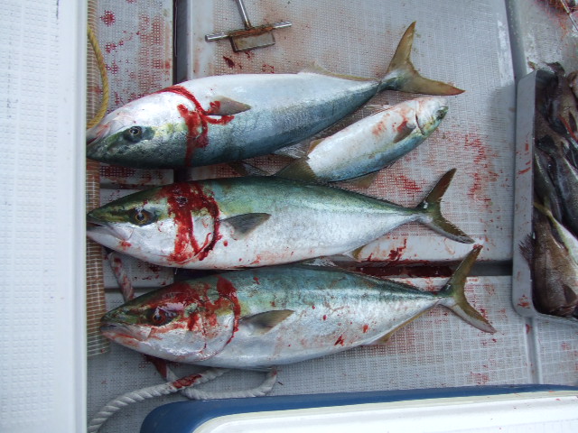 釣果情報(04/27) フィッシング 2008年04月27日 ハマチ70cmオーバーを3本、30cmオーバーを3本、その他マダイ、メバルなど。 情島周辺での釣果。 ハヤブサの真鯛サビキ8号使用で、竿ではなく手釣り。 給油中に絞めていましたが、デッキが凄いことに!! お疲れさまでした~。